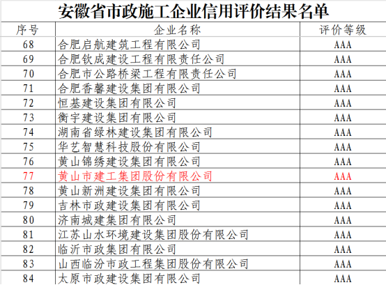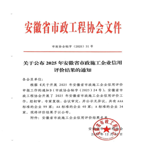 近日,安徽省市政工程协会正式发布《KY平台公布2025年安徽省市政施工企业信用评价结果的通知》。黄山市建工集团凭借卓越的综合实力、规范的市场行为、优良的工程品质及坚实的信用体系建设,成功获评最高信用等级——AAA级。标志着集团在诚信经营、履约能力与社会责任履行方面获得了行业主管部门与协会的高度认可,是企业信用建设领域的又一重要里程碑。